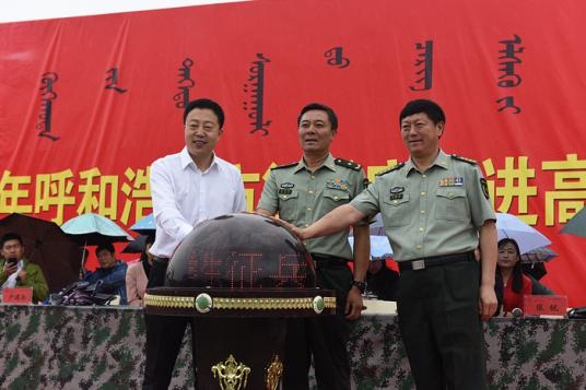 6月6日上午,2017年呼和浩特市征兵宣传进高校暨大学生征兵启动仪式在内蒙古财经大学玉龙广场隆重举行。内蒙古军区副司令员张英奎、副参谋长许中林等,自治区党委教育系统工委专职副书记、教育厅党组成员张锐,呼和浩特警备区司令卢建永等,呼和浩特市民政局局长张俊江等,内蒙古大学党委书记朱炳文,内蒙古财经大学校长杜金柱、副校长王立出席大会。呼和浩特警备区司令卢建永主持大会。教育厅学工处、驻呼各高校领导,内蒙古财经大学相关部门负责同志、教师和学生代表900余人参加大会。